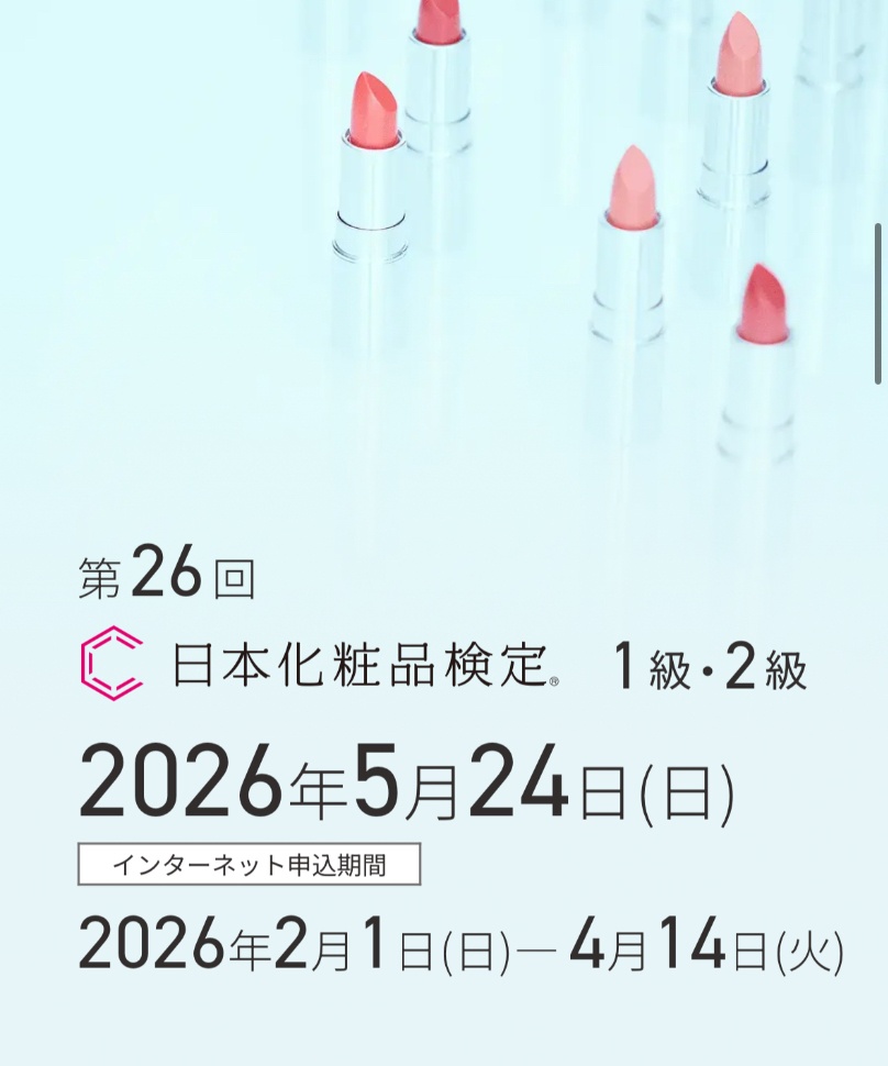 | 日本化粧品検定を共に学び、あなたも美のプロを目指しませんか? 美容誌や多数のメディアで取り上げられている 『日本化粧品検定』は、 化粧品のスペシャリストを育成する為の検定です *就職活動中の方 *転職予定の方 *ライター希望の方 *自分の美容知識として!! *化粧品販売の方 *美容のスペシャリストとして!! *エステティシャンのカウンセリング術として!! *美容師さん *商品開発の方 など。。 様々なシーンでご活躍されています |